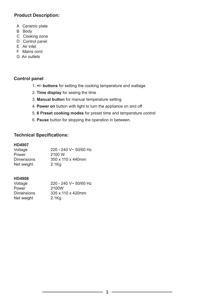 Philips HD4907 - Product Description; Control Panel; Technical Specifications