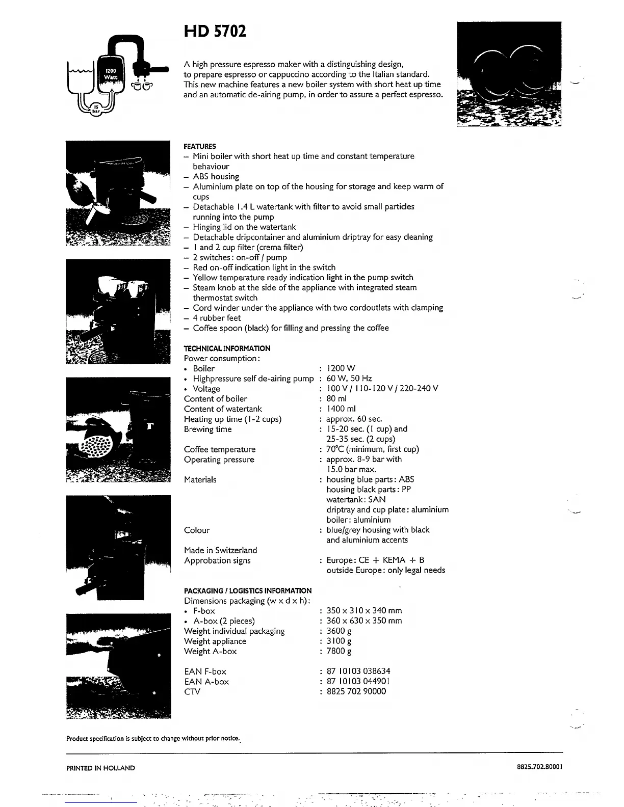 Philips HD5702/90 - Product Features; Technical Specifications; Materials Used; Color Description