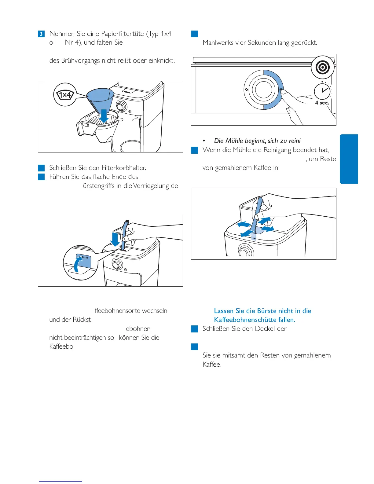 • Die Reste des gemahlenen Kaffees fallen in