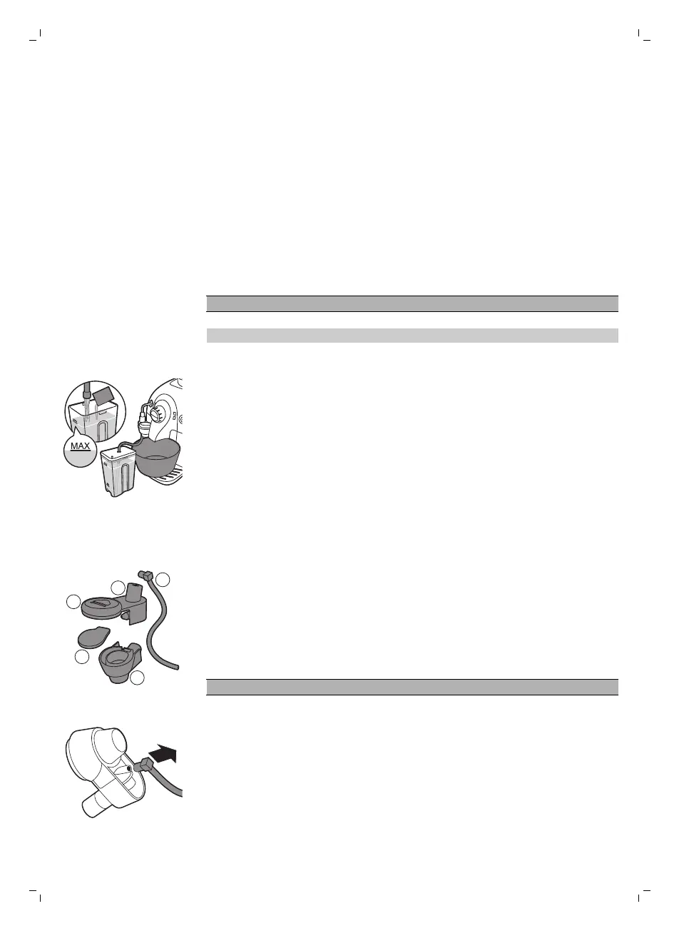 6 拆下咖啡機的吸塵管。 徹底清洗牛奶罐,然後以清水裝滿至 MAX 刻度。