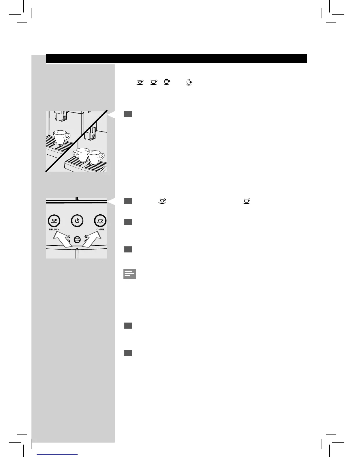To brew 1 cup of espresso or co ee, press the desired button once. The
