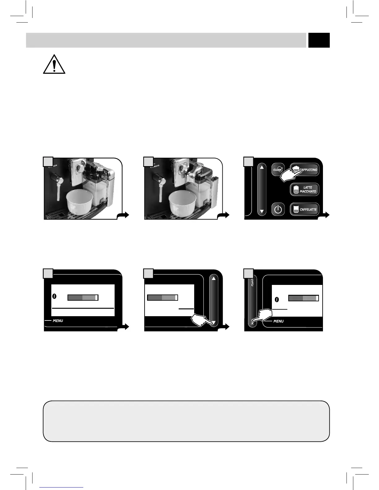 BREWING MAY BE PRECEDED BY SHORT SPURTS OF MILK AND STEAM: RISK OF SCALDING! REFER TO THE SECTION