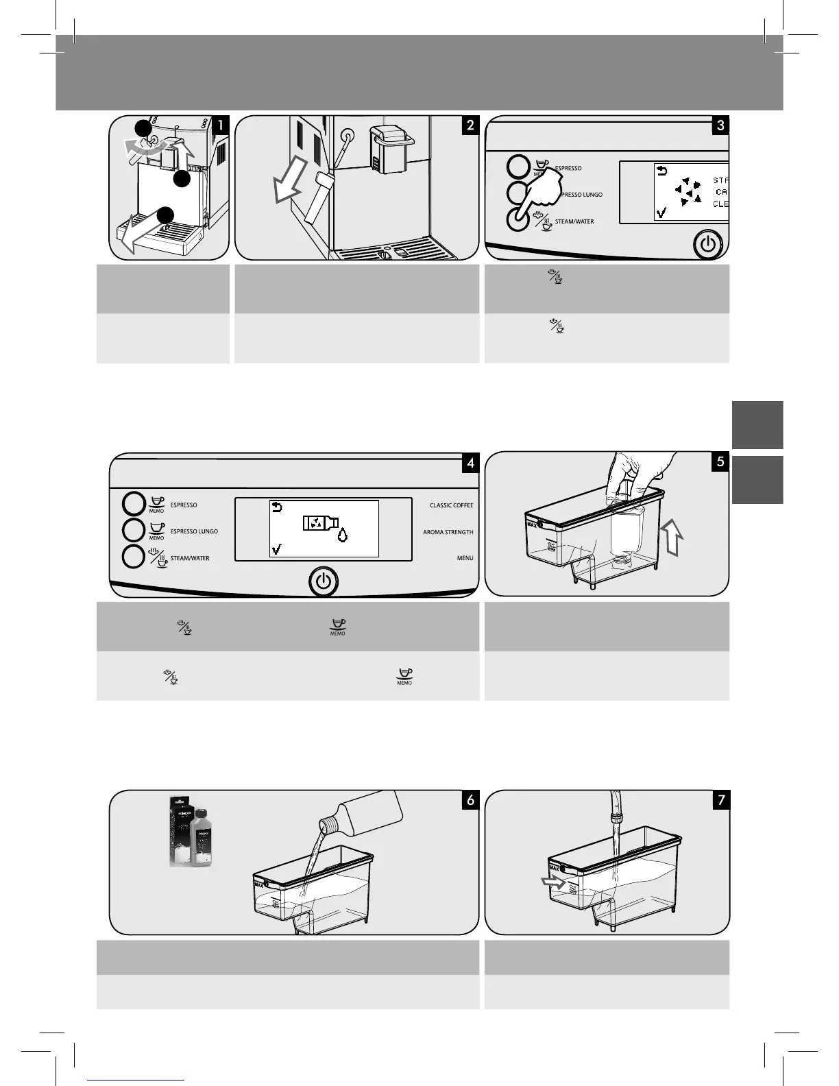 Nalejte do nádržky na vodu všetok roztok na odstránenie vodného kameňa. Nádržku naplňte čerstvou vodou až po hladinu CALC CLEAN