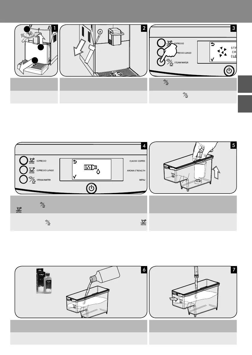 Das gesamte Entkalkungsmittel in den Wassertank einfüllen. Den Wassertank bis zum Füllstand CALC CLEAN mit frischem