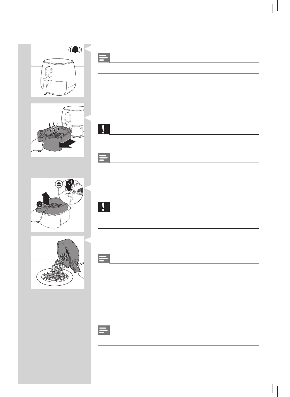 • 在烹饪完每批原料后或在摇晃或更换煎锅中的炸篮之前,您可能要小心