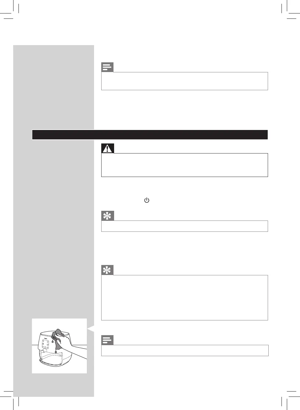 • 如果食物残渣粘在煎锅或炸篮上,可以将其在加入清洁剂的热水中浸泡
