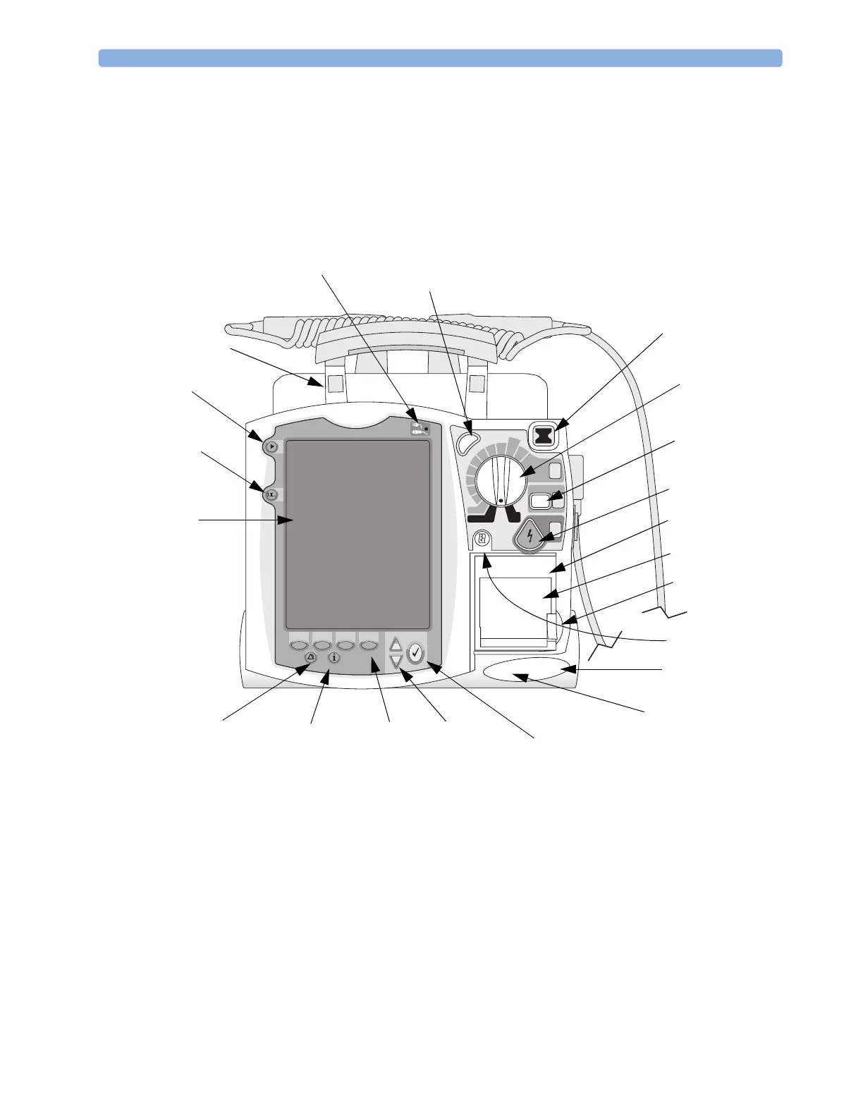 Additional controls and indicators are on the paddles (if used) and batteries.