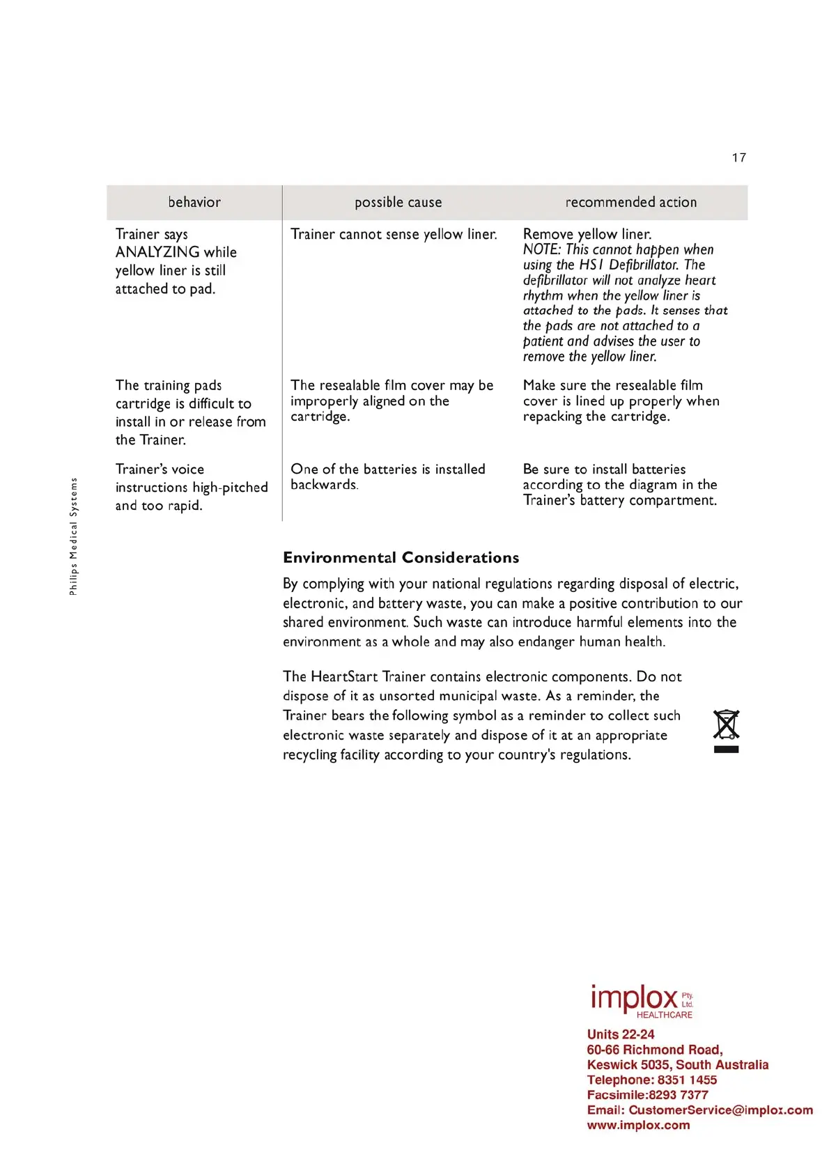 Philips HeartStart Trainer - Advanced Troubleshooting and Environmental Care; Pads and Liner Detection Issues; Environmental Considerations