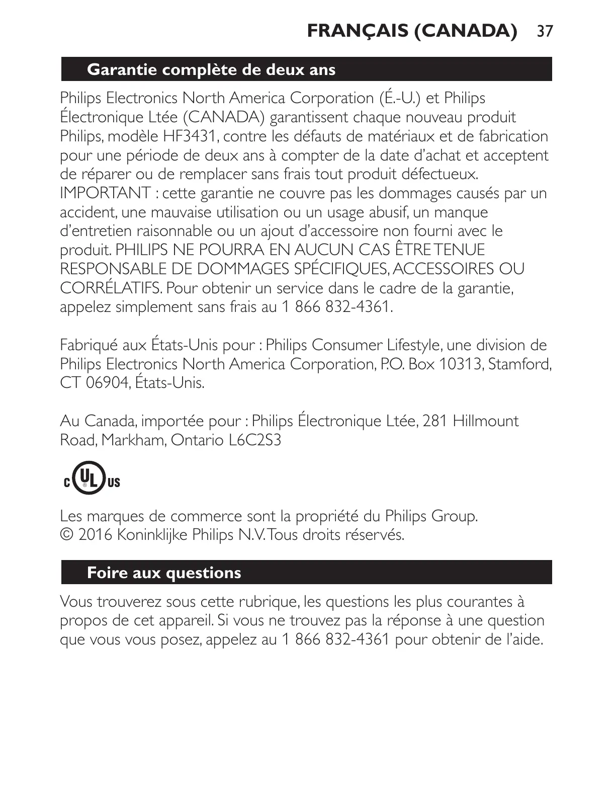 Philips, modèle HF3431, contre les défauts de matériaux et de fabrication