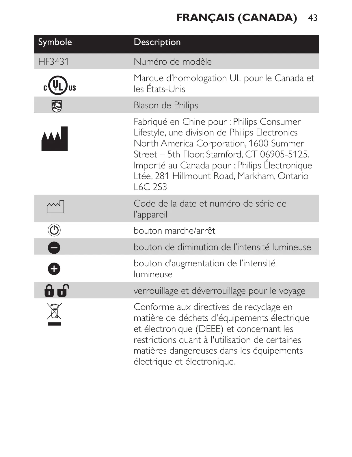 Importé au Canada pour : Philips Électronique