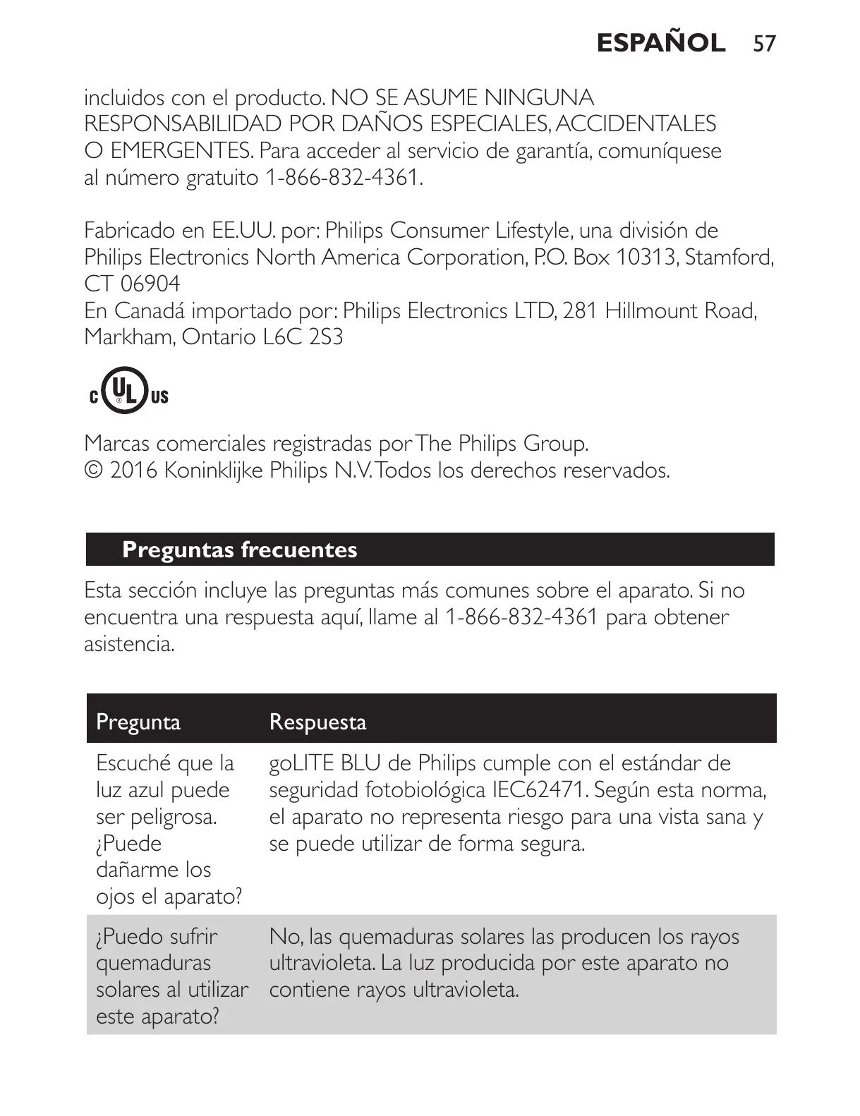 Fabricado en EE.UU. por: Philips Consumer Lifestyle, una división de