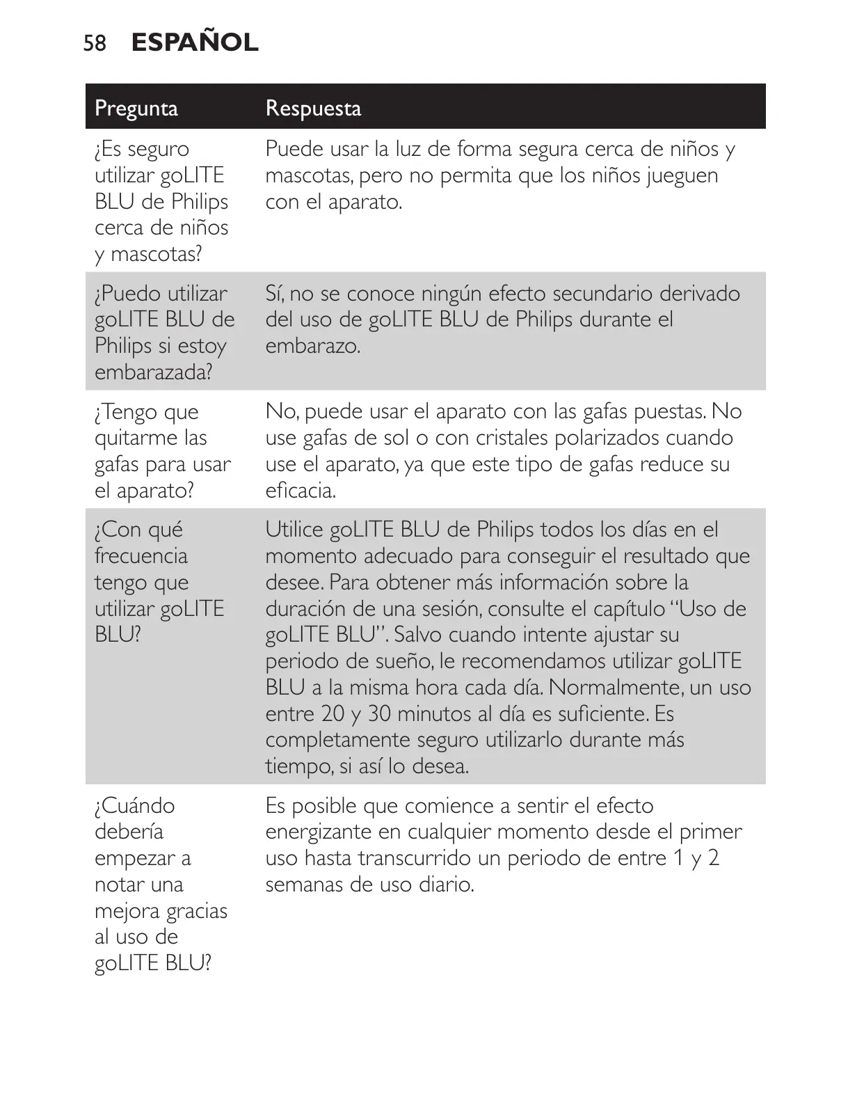 del uso de goLITE BLU de Philips durante el
