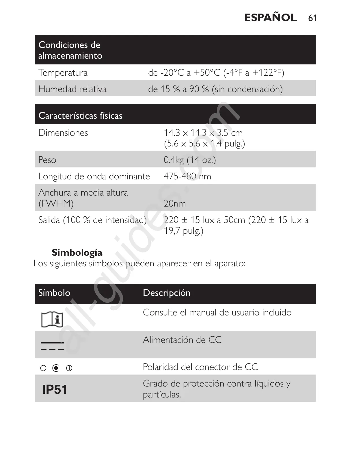 Salida (100 % de intensidad) 220 ± 15 lux a 50cm (220 ± 15 lux a