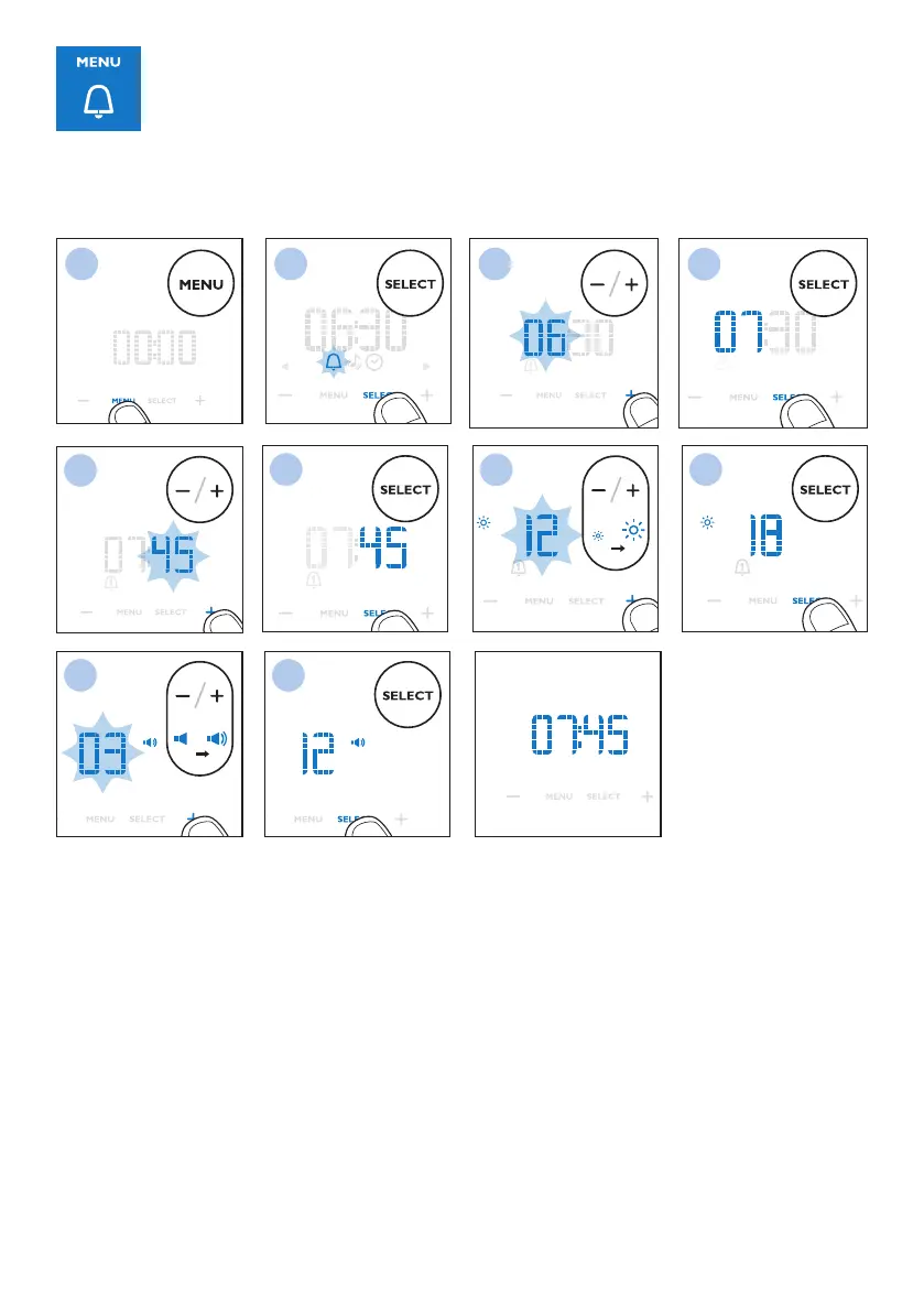 (pasos 7 y 8) y el nivel de sonido (pasos 9 y 10) con los que desea despertarse.