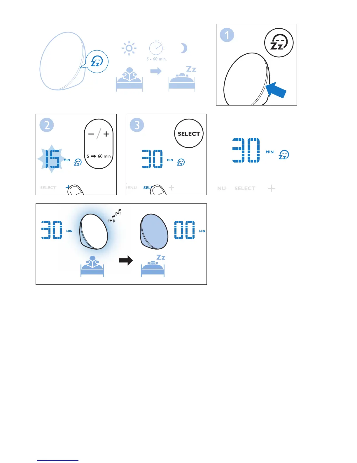Obs! Om du trycker på insomningsknappen när varken lampan eller FM-funktionen är på, tänds