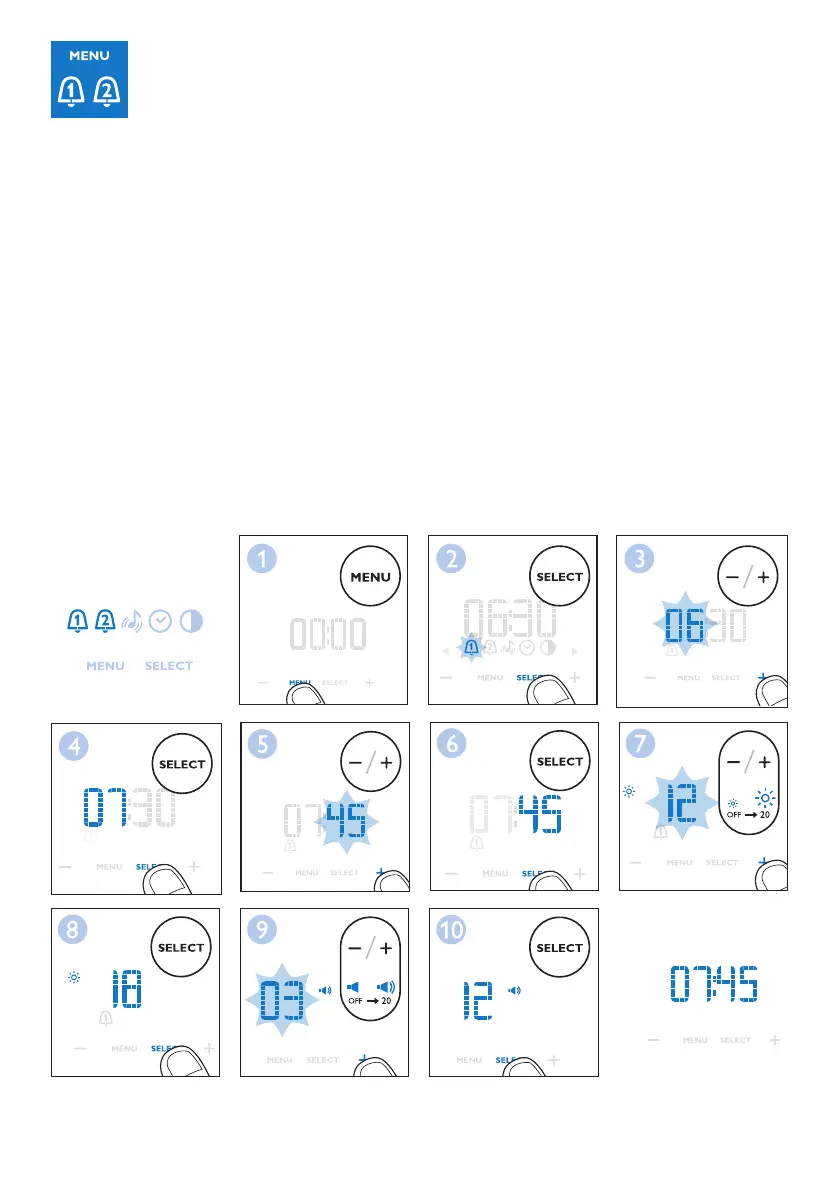 (trin 7 og 8) og lydniveauet (trin 9 og 10), som du vil vågne op til. Du kan indstille to forskellige