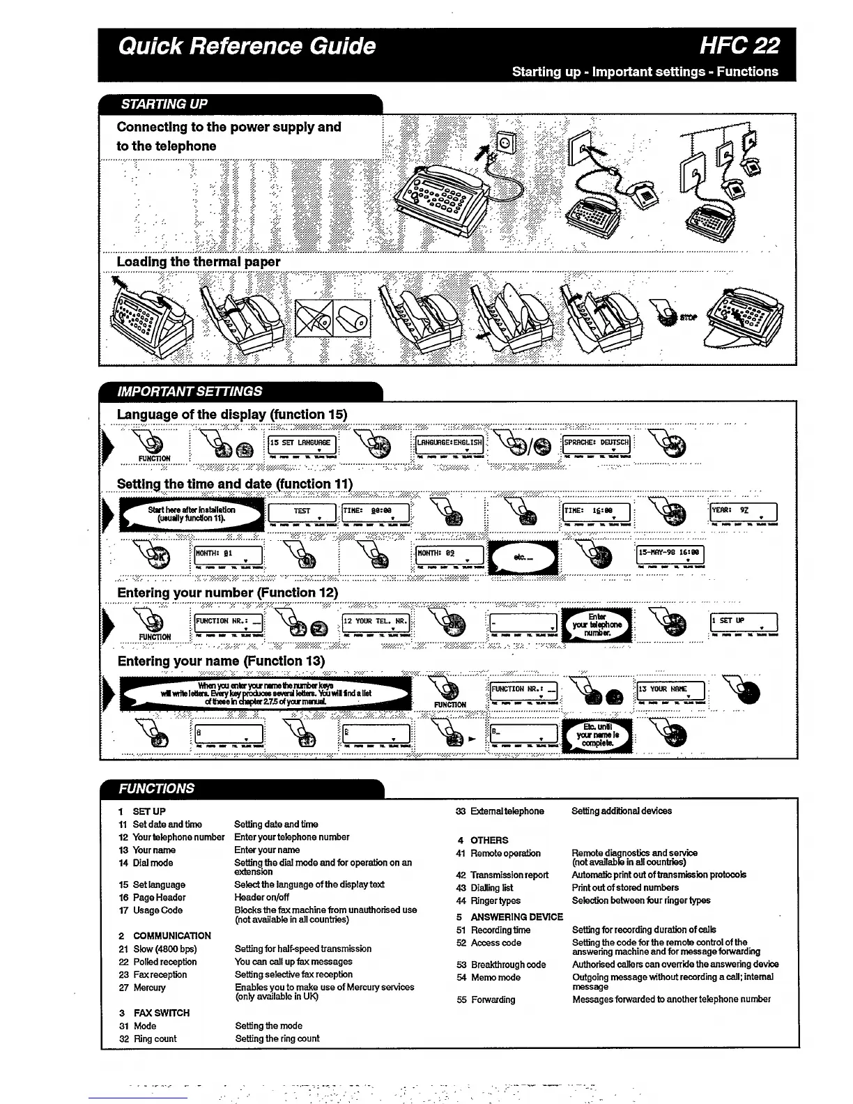 Philips HFC 22 - Quick Reference Guide; Starting up; Important Settings; Functions