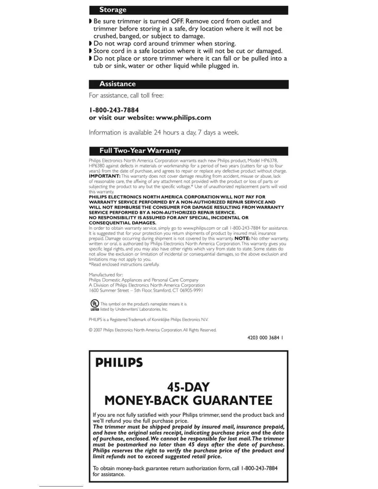 Philips HP6378 - Storage, Support, and Guarantees; Proper Storage of Trimmer; Customer Assistance and Contact; Product Warranty and Guarantee Details