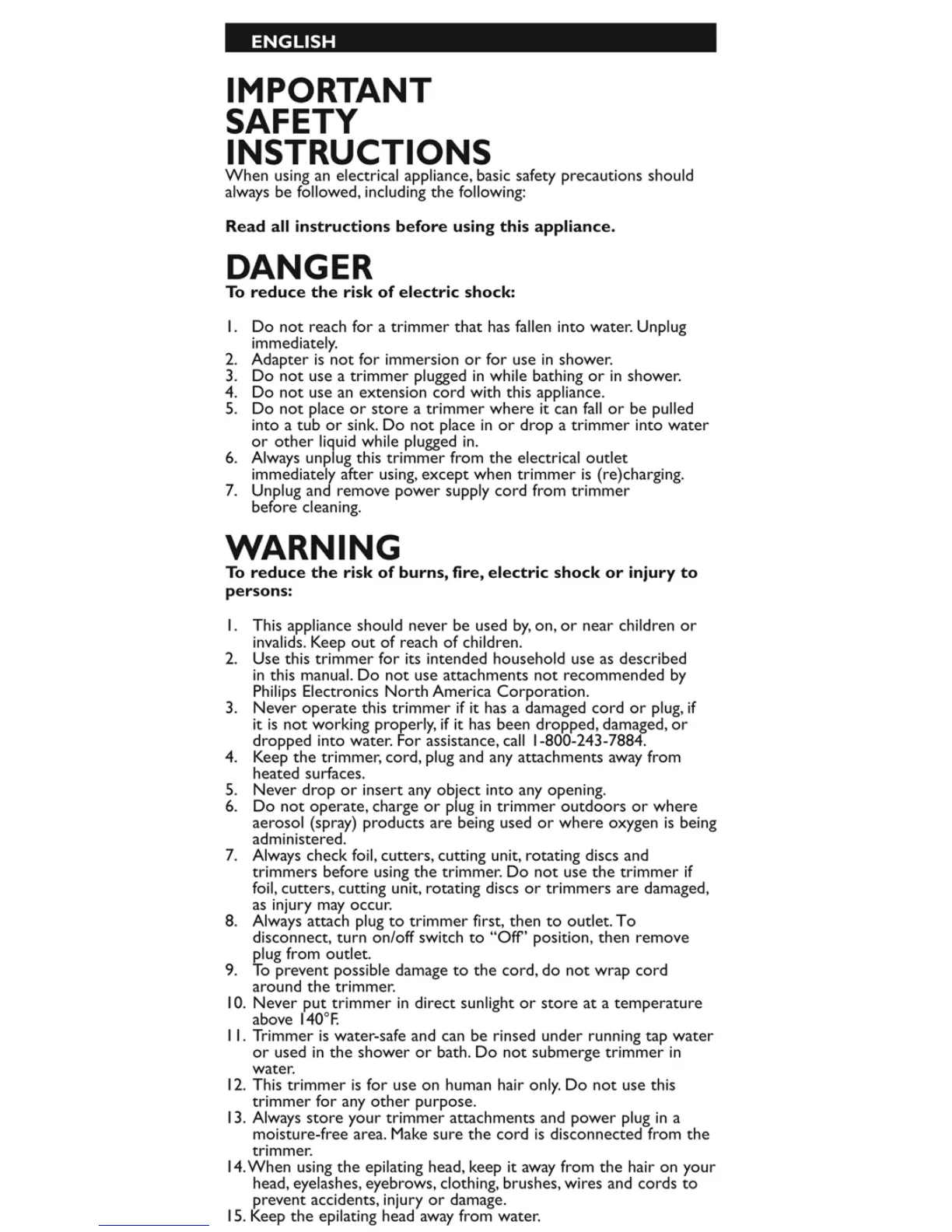Philips HP6378 - Important Safety Instructions; DANGER: Risk of Electric Shock; WARNING: Risks of Burns, Fire, Injury