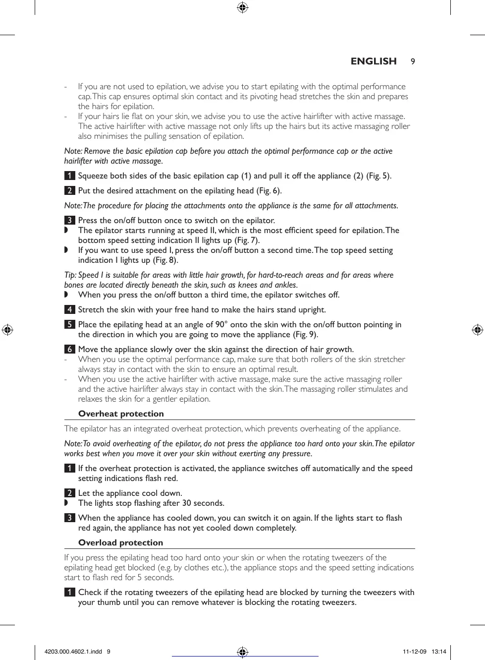 epilating head get blocked (e.g. by clothes etc.), the appliance stops and the speed setting indications