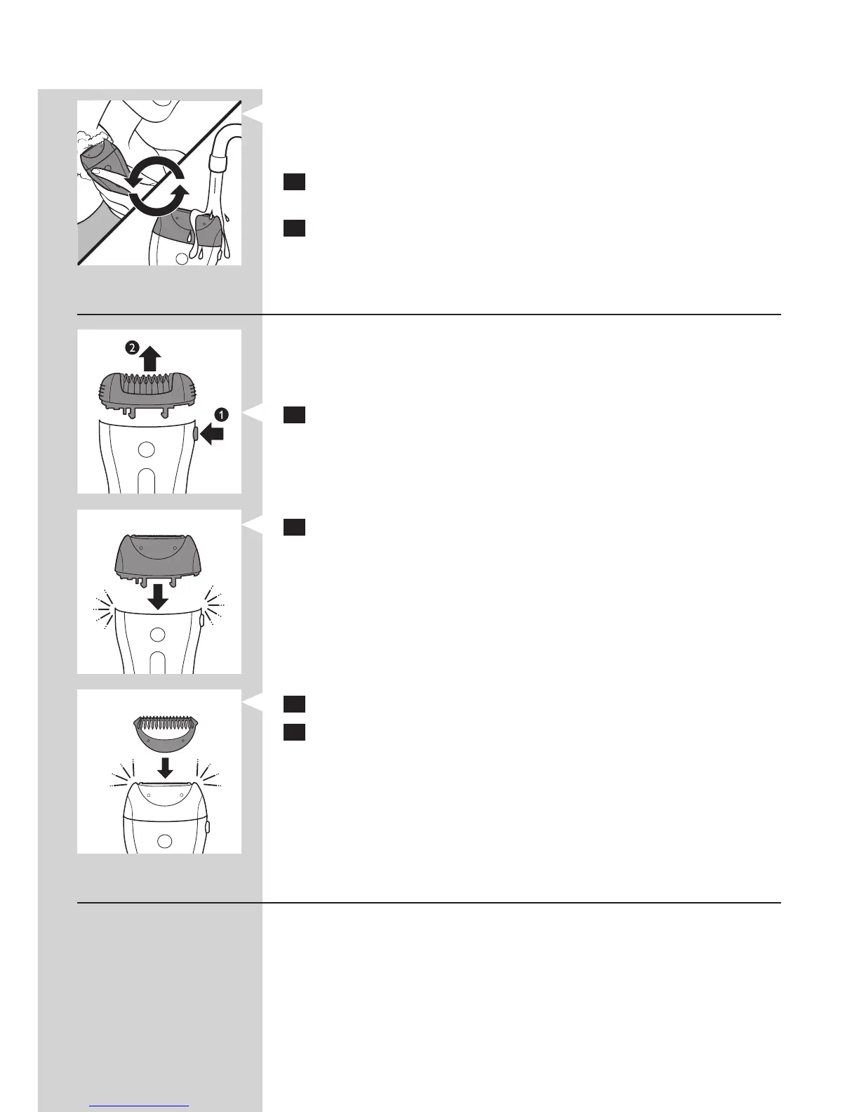 1 열림버튼을눌러서(1)제모헤드를분리하십시오(2).
