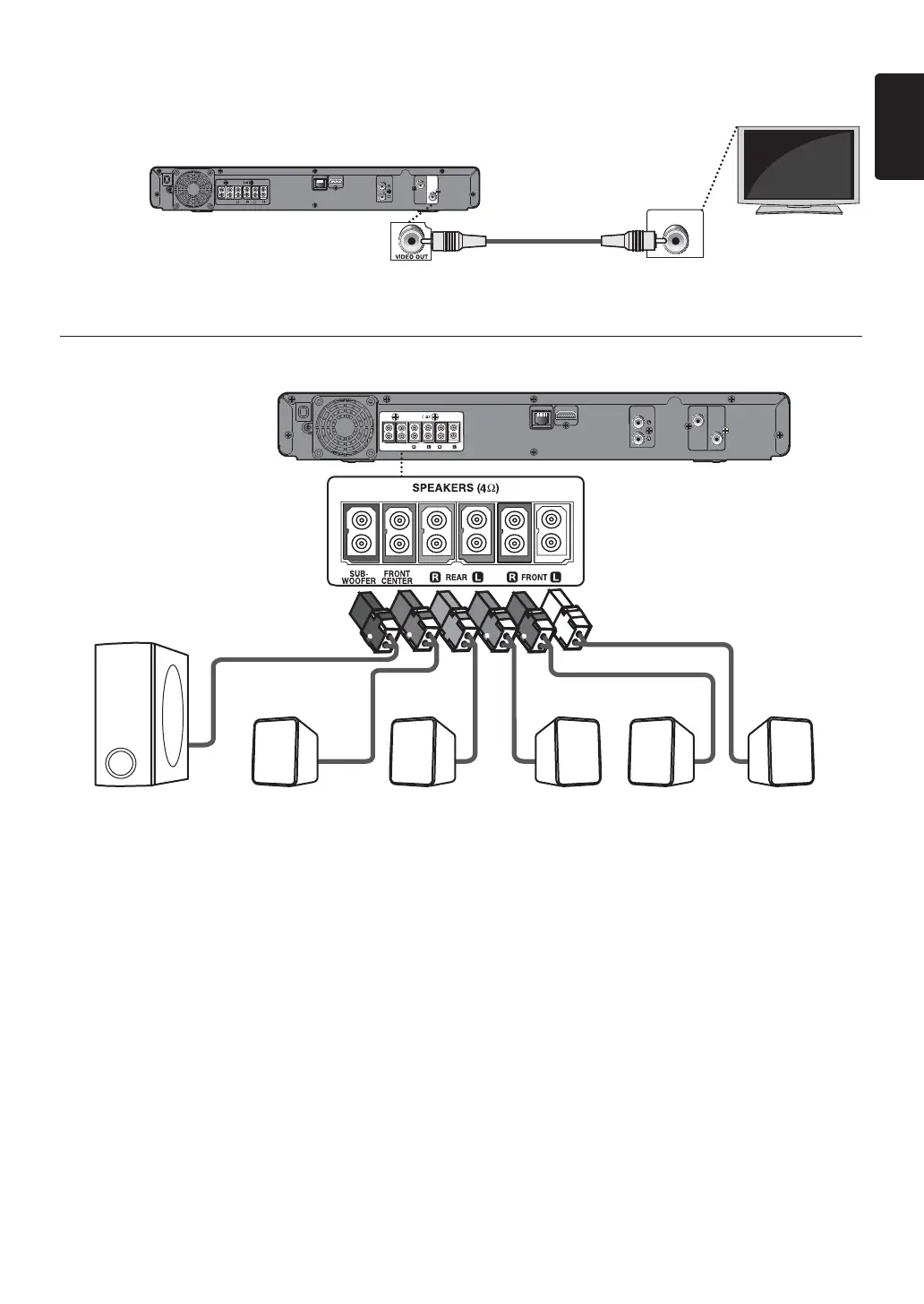2. Connect all the speakers and subwoofer to the matching sockets at the rear of the main unit.