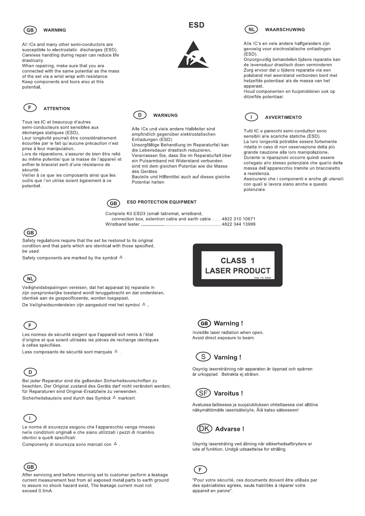 Philips HTS3365/55 - ESD and Safety Precautions; ESD Protection Equipment; Laser Safety Warning