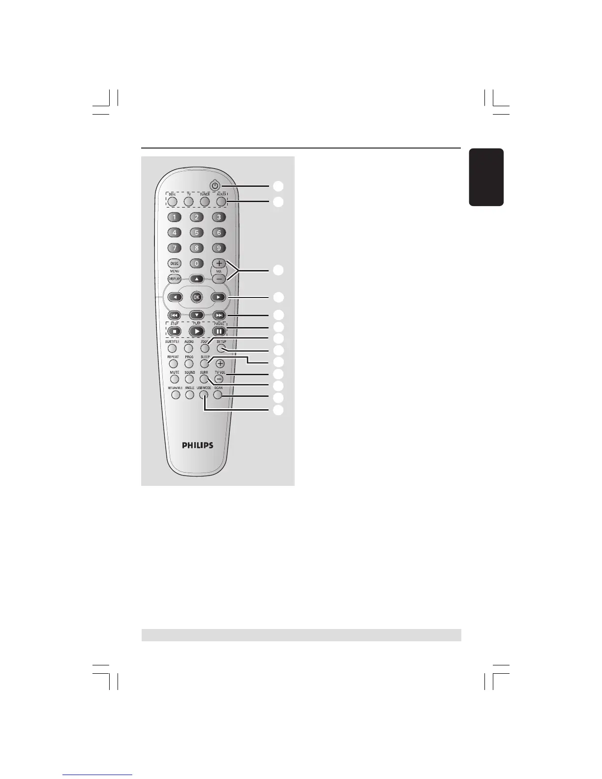 – Adjusts TV volume (Philips TV only).