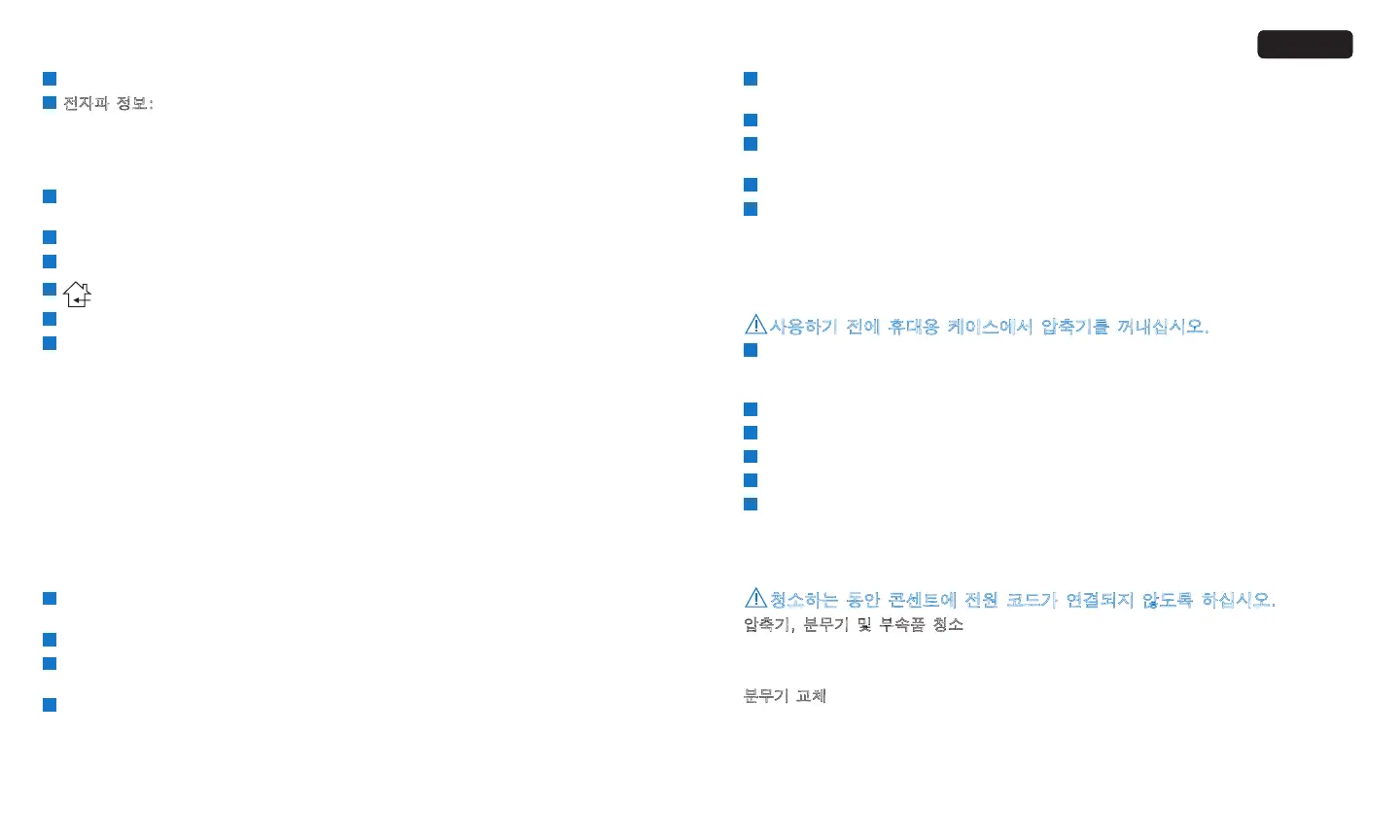 압축기를 이런 장치에서 멀리 떼어 놓으십시오. 이 장치는 전자파 적합성(EMC)을