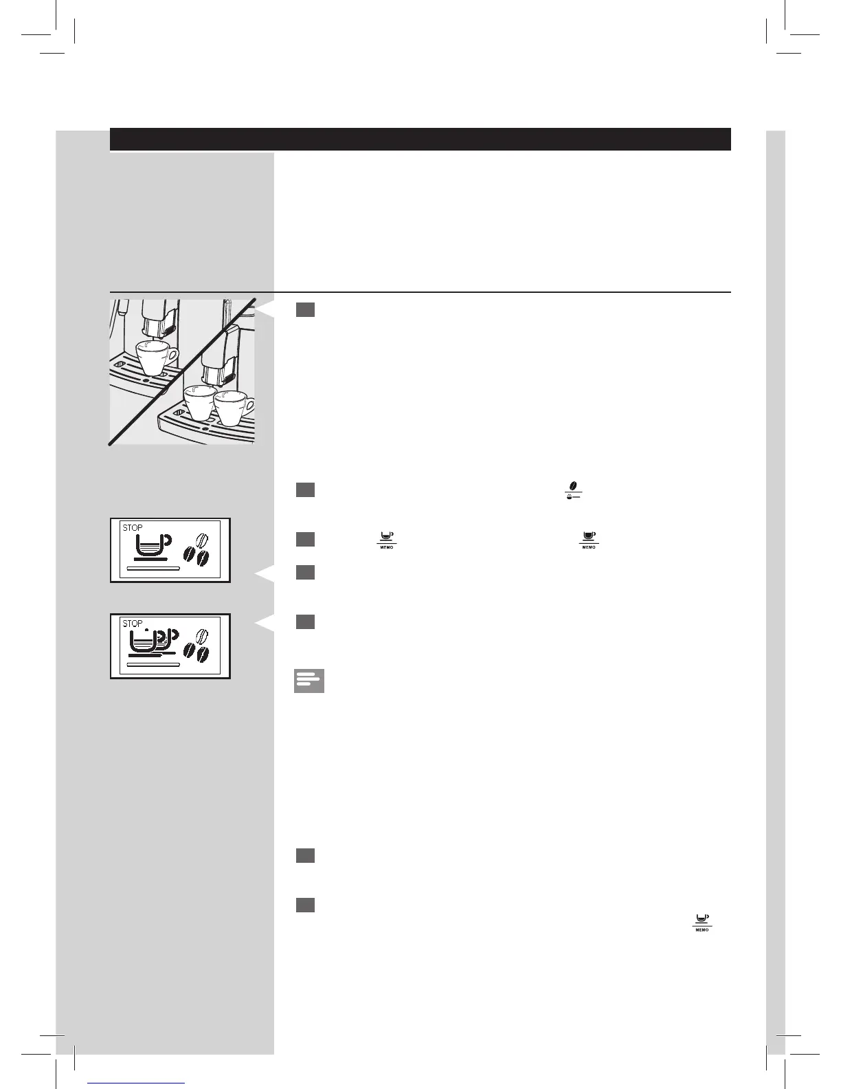 To brew 1 cup of espresso or co ee, press the desired button once. This