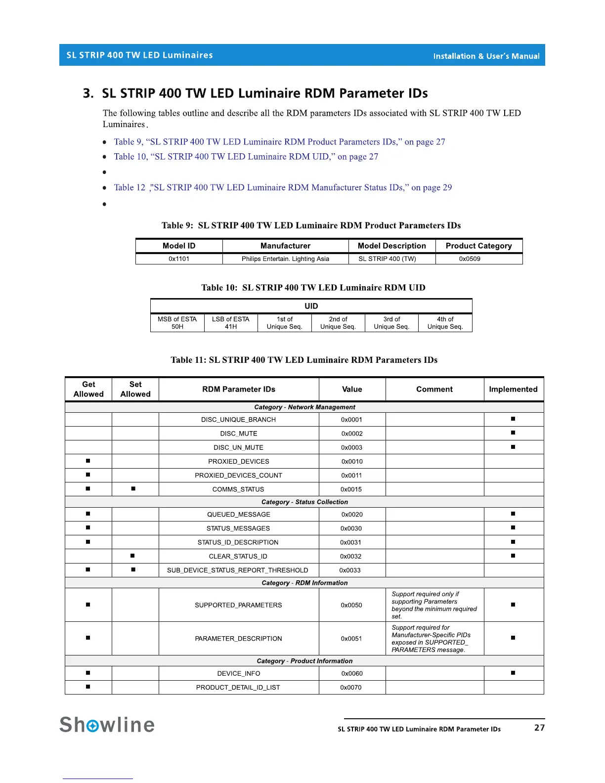 Table 11, SL STRIP 400 TW LED Luminaire RDM Parameter IDs, on page 27