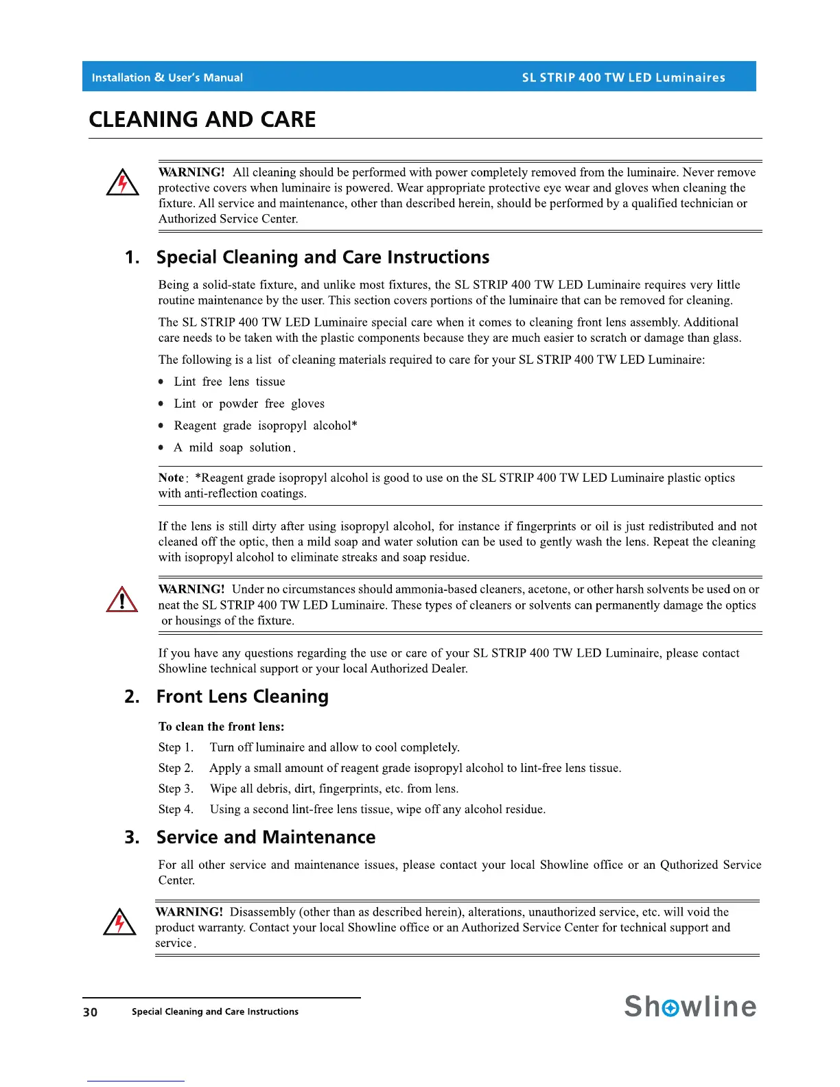 Philips IP65 - Cleaning and Care; Special Cleaning and Care Instructions; Front Lens Cleaning; Service and Maintenance