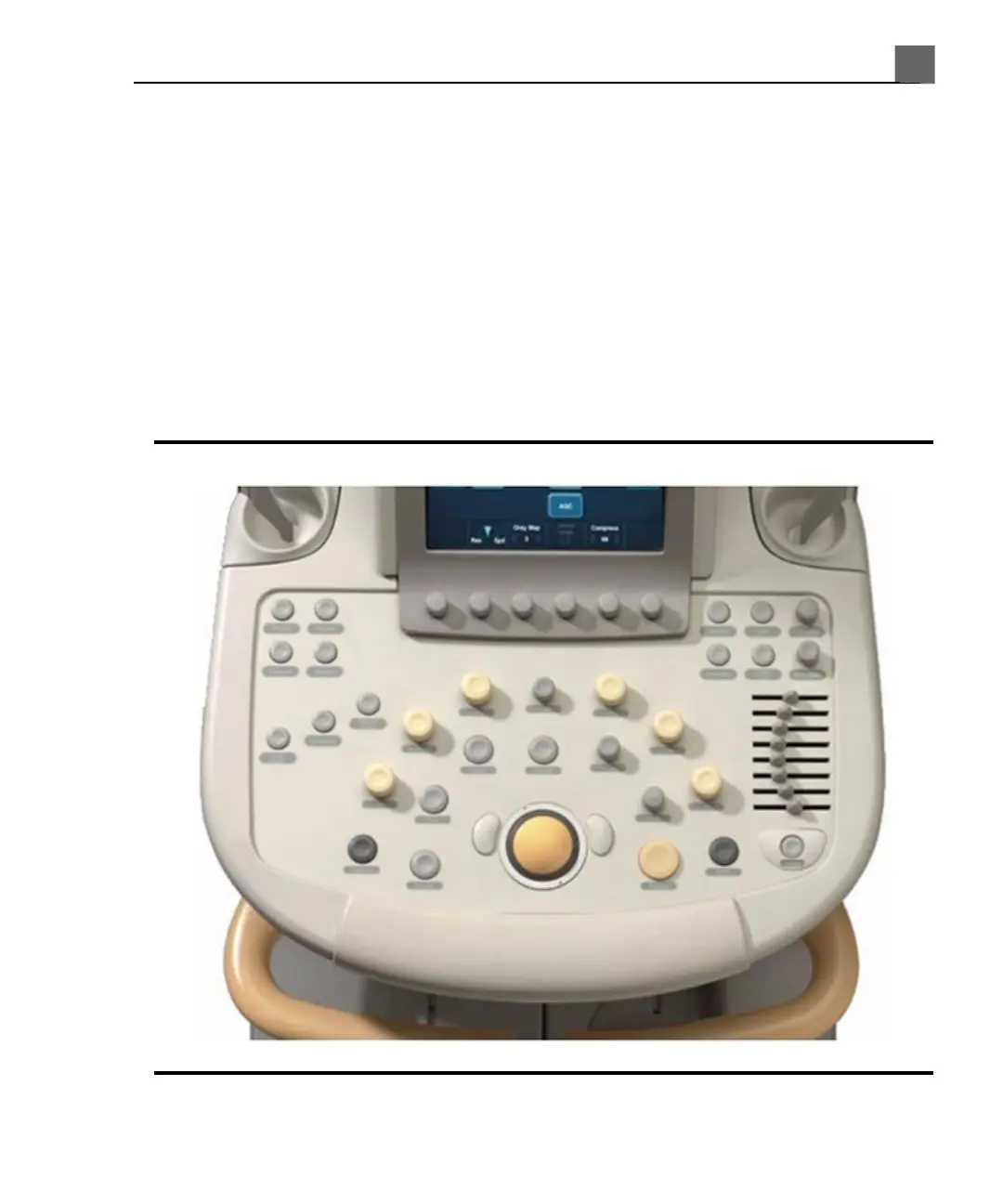 controls. These controls include knobs, buttons, TGC slide controls, and a