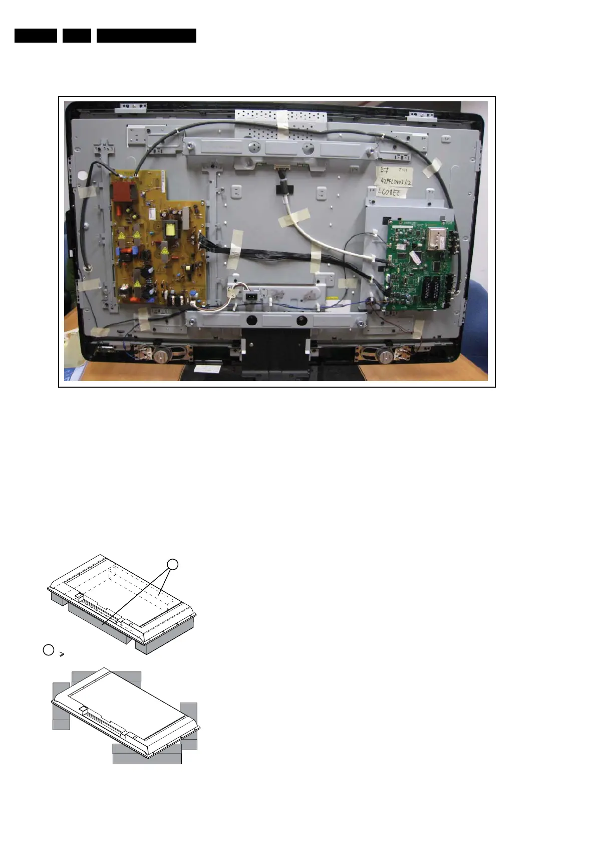 By laying the TV face down on the (ESD protective) foam bars,