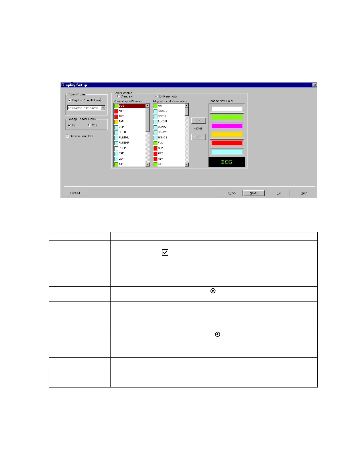 Display Setup Display Setup is used to configure the display of patient data on the Main Screen and in the