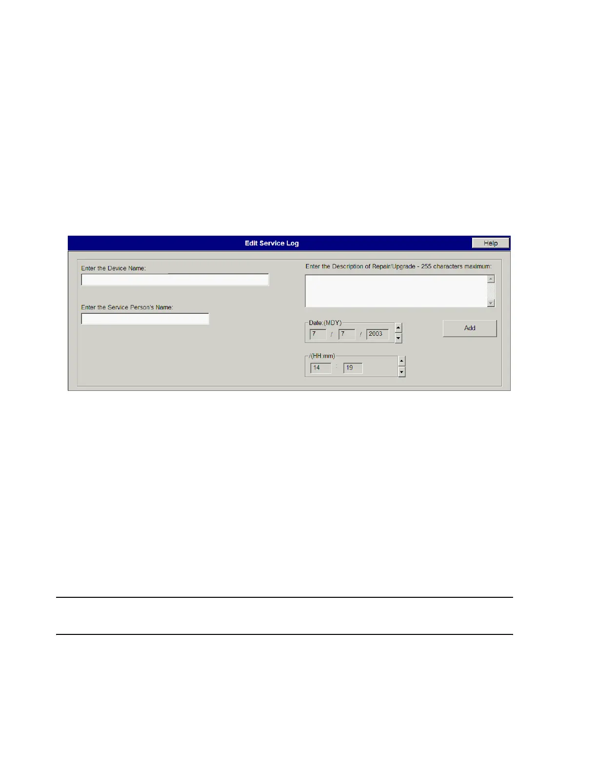 The Edit Service Log window is used to add information to the Service Log on devices