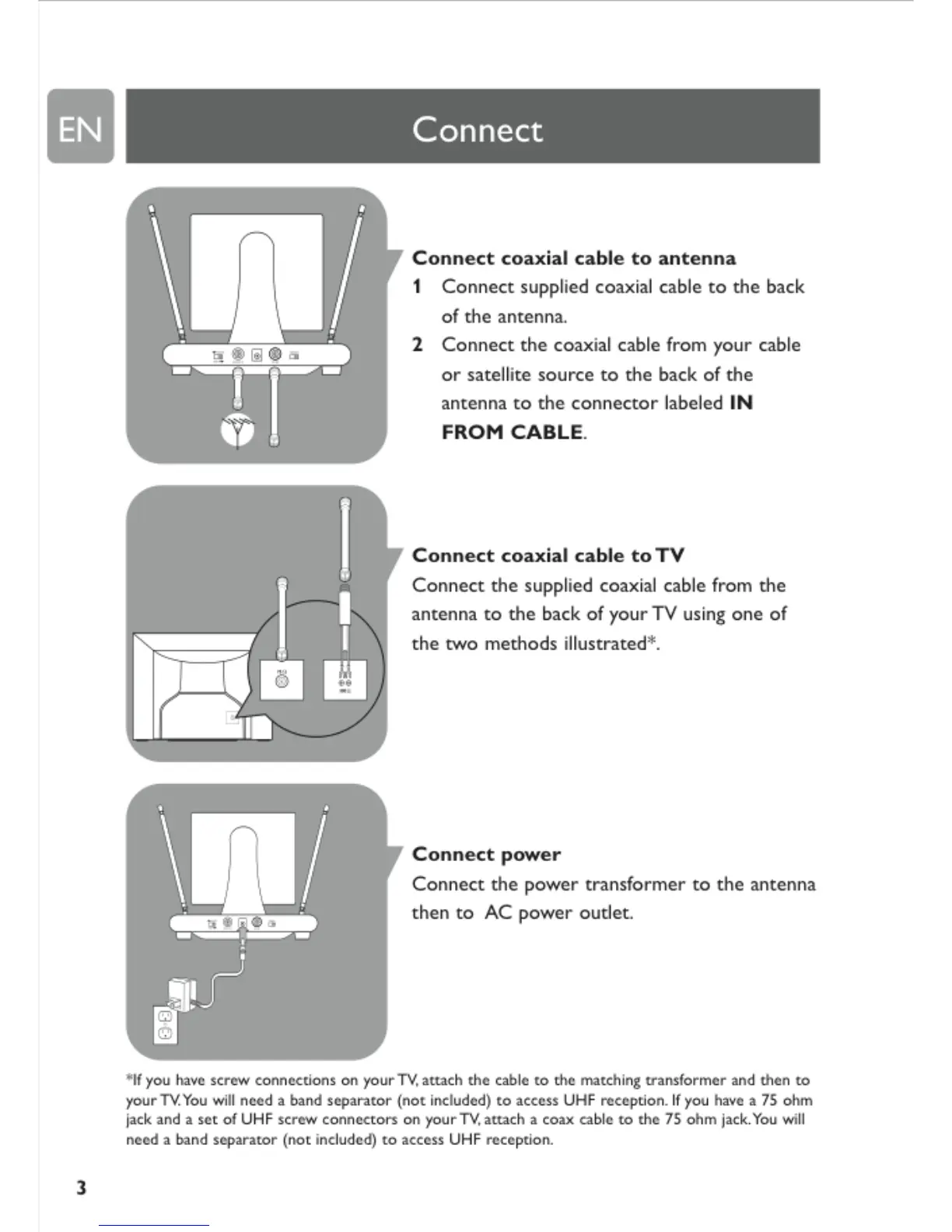 Philips MANT510 - Connect Antenna and Power; Connect Coaxial Cable to Antenna; Connect Coaxial Cable to TV; Connect Power Transformer