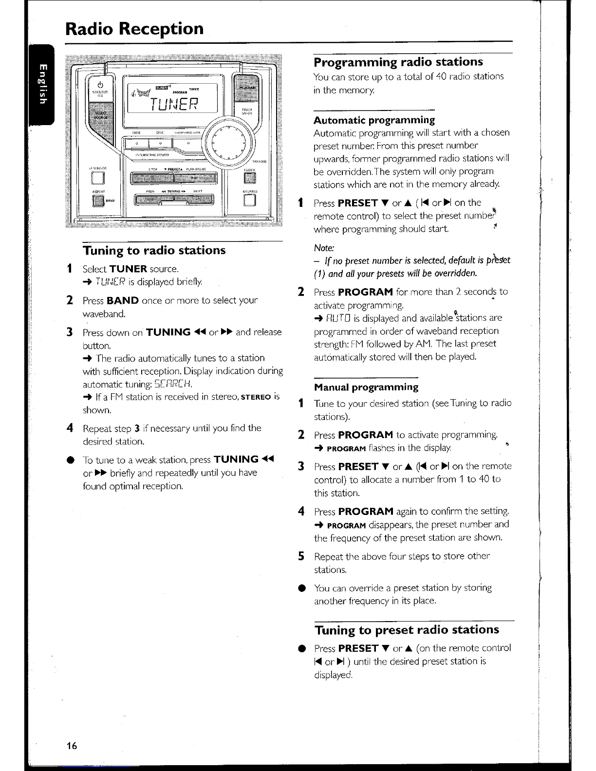 Philips MC 105 - Radio Reception; Tuning Radio Stations; Programming Radio Stations