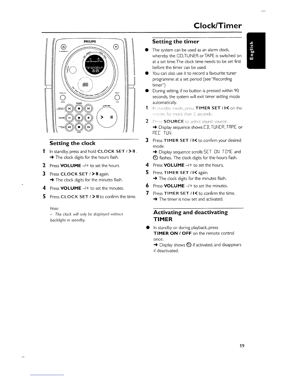 Philips MC-320 - Clock and Timer Functions; Setting the System Clock; Timer and Sleep Mode Activation