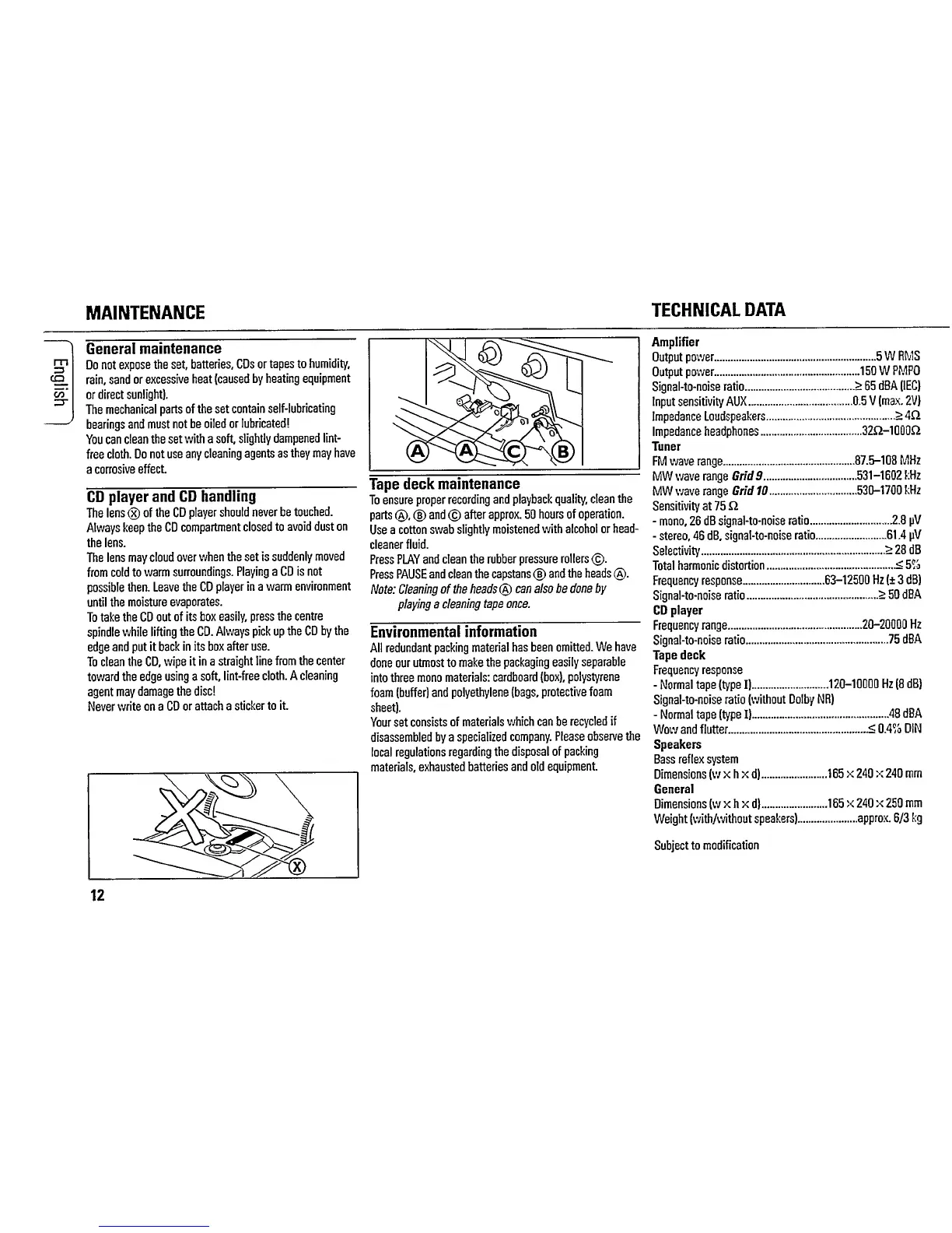 Philips MC115/02 - Maintenance; Technical Data; General Maintenance; CD Player and CD Handling