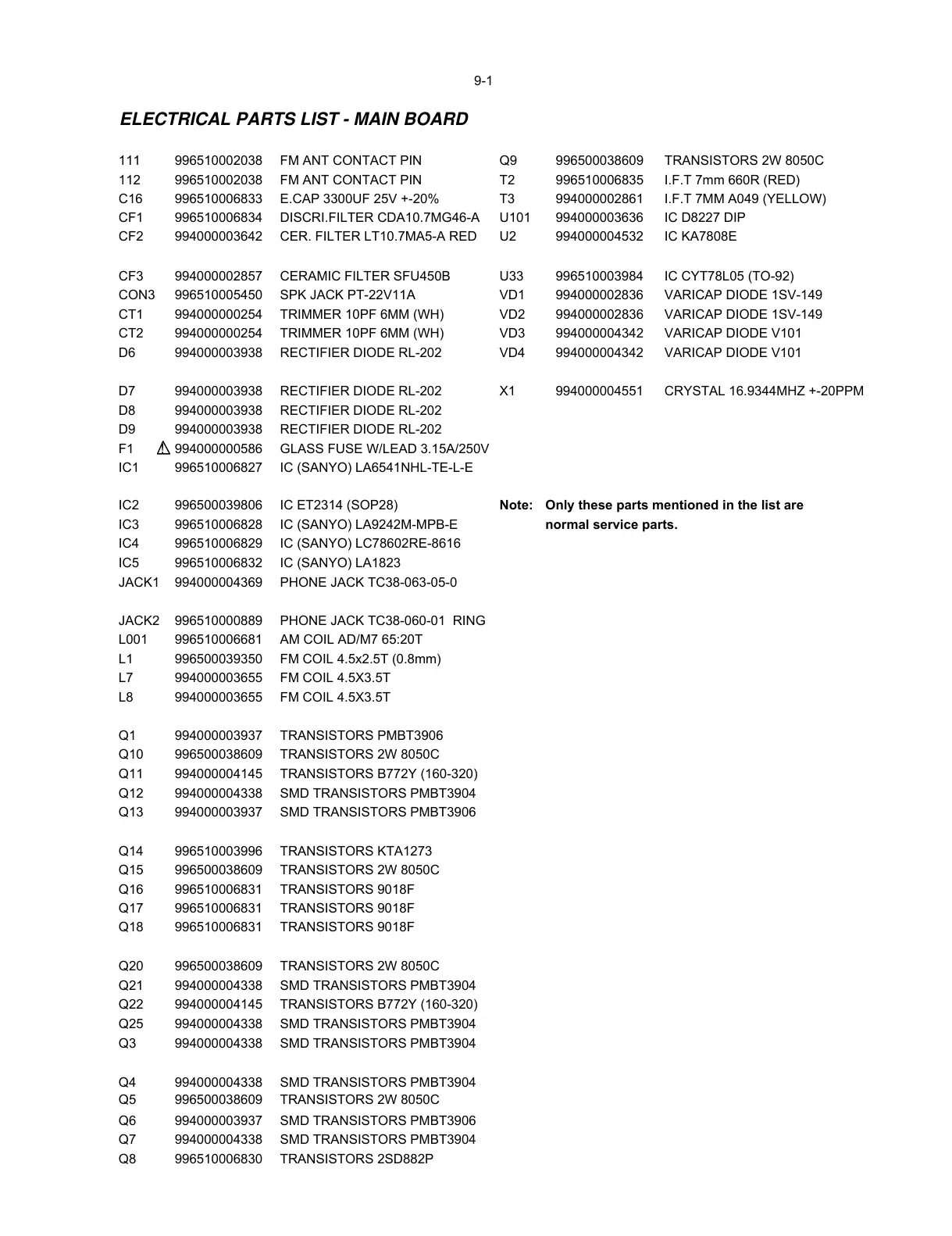 111 996510002038 FM ANT CONTACT PIN Q9 996500038609 TRANSISTORS 2W 8050C