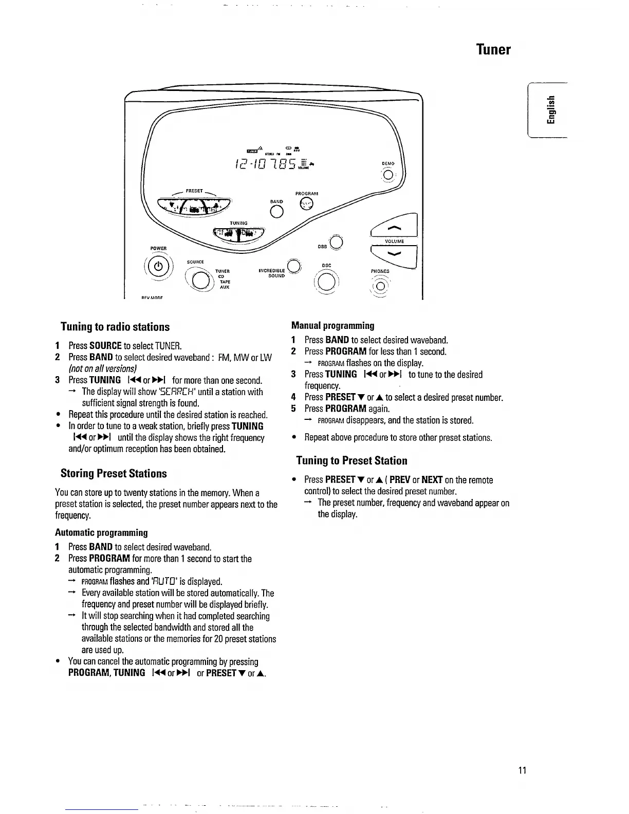 Philips MC170/22 - Tuner; Tuning to Radio Stations; Storing Preset Stations; Manual Programming