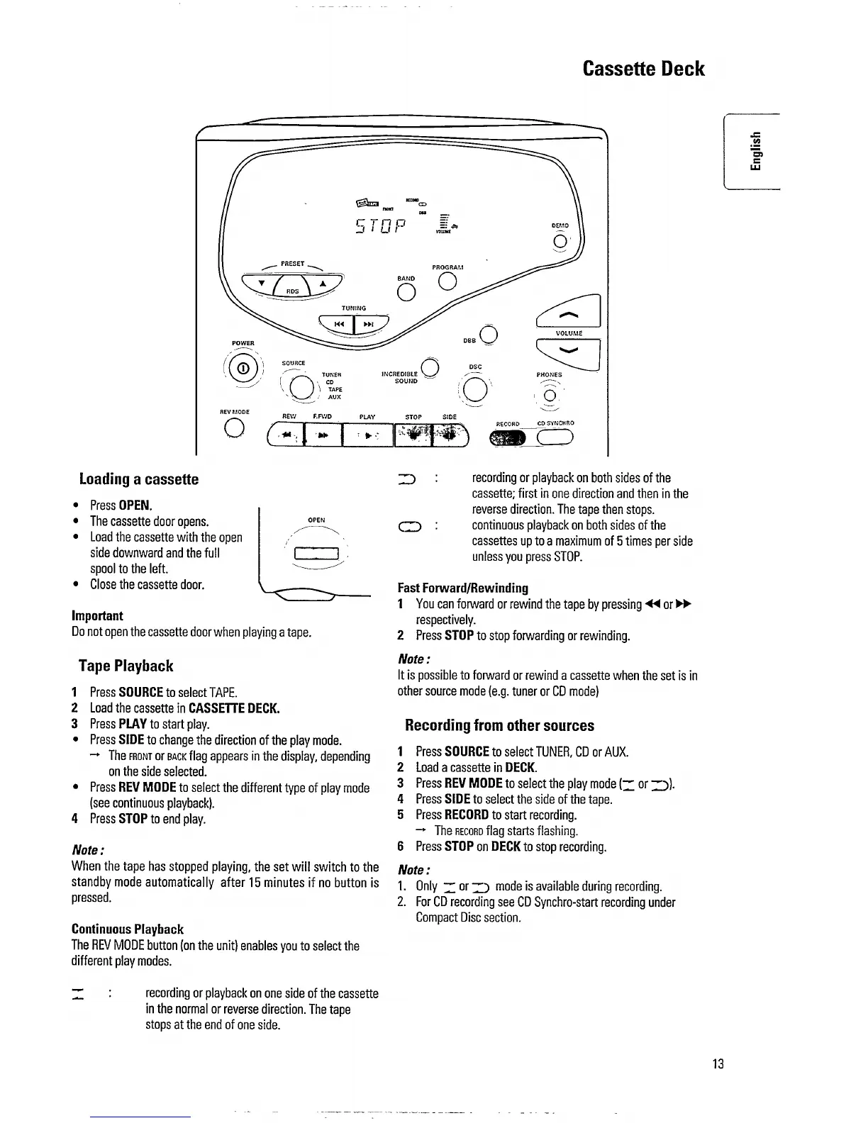 Philips MC170/22 - Loading a Cassette; Tape Playback; Continuous Playback; Fast Forward;Rewinding