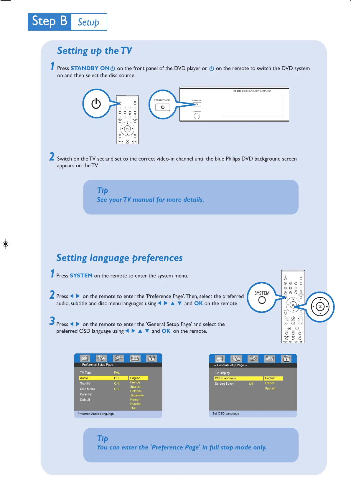 Press STANDBY ONB on the front panel of the DVD player or B on the remote to switch the DVD system