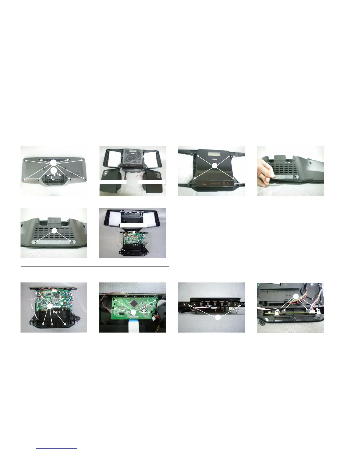 1)Remove 8 screws A as indicated to loosen the speaker cabinet.
