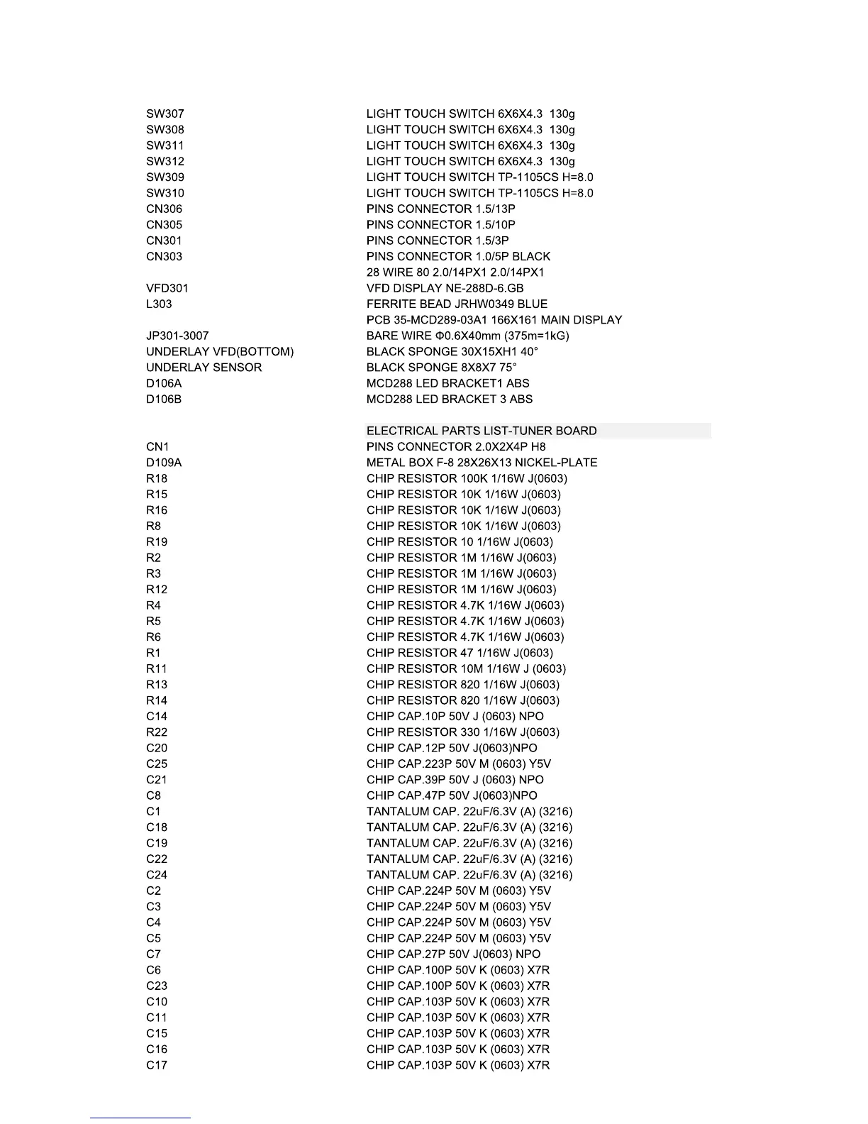 FACTORY PARTLIST