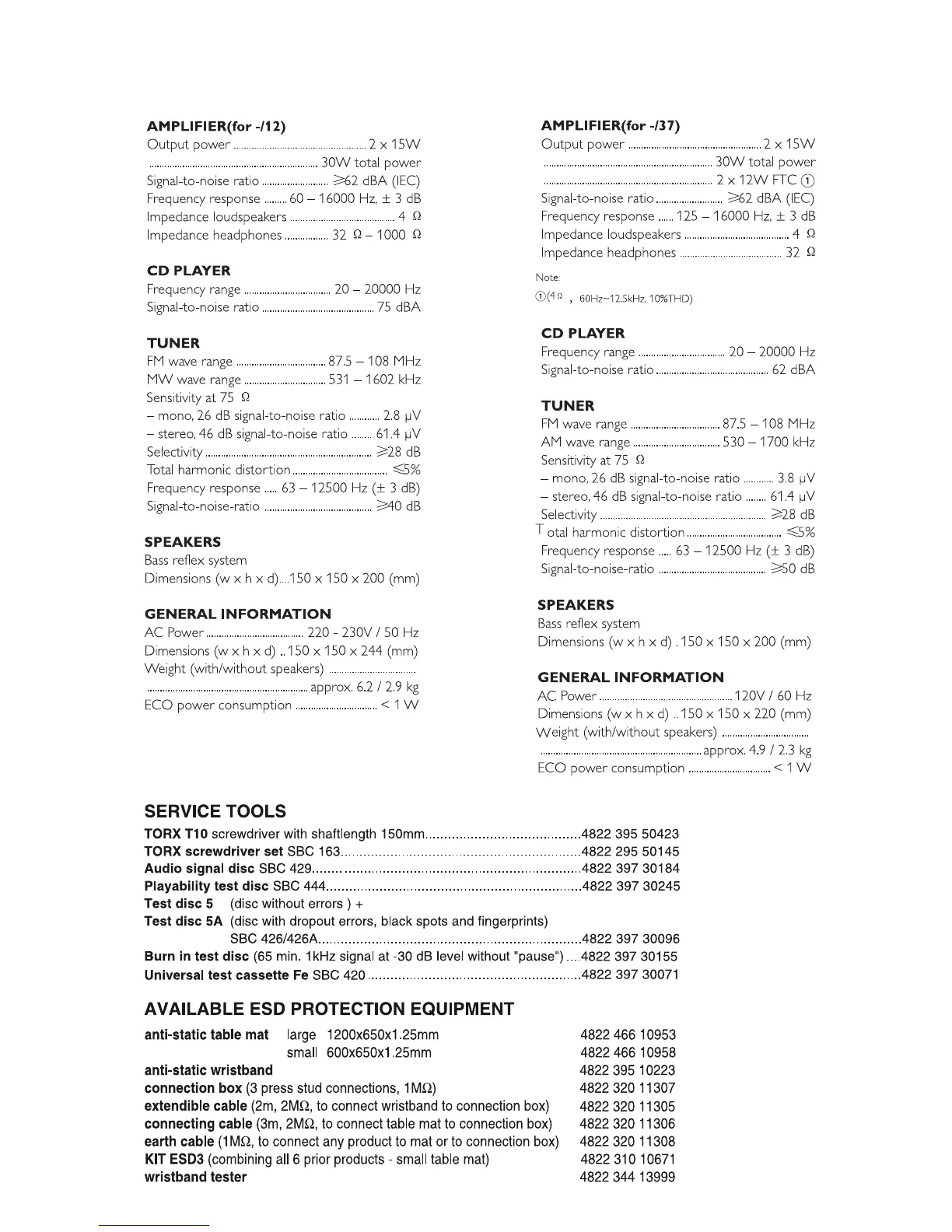 Philips MCM128B - Technical Specifications; Amplifier Specifications; CD Player and Tuner Specifications; Speaker and General Information
