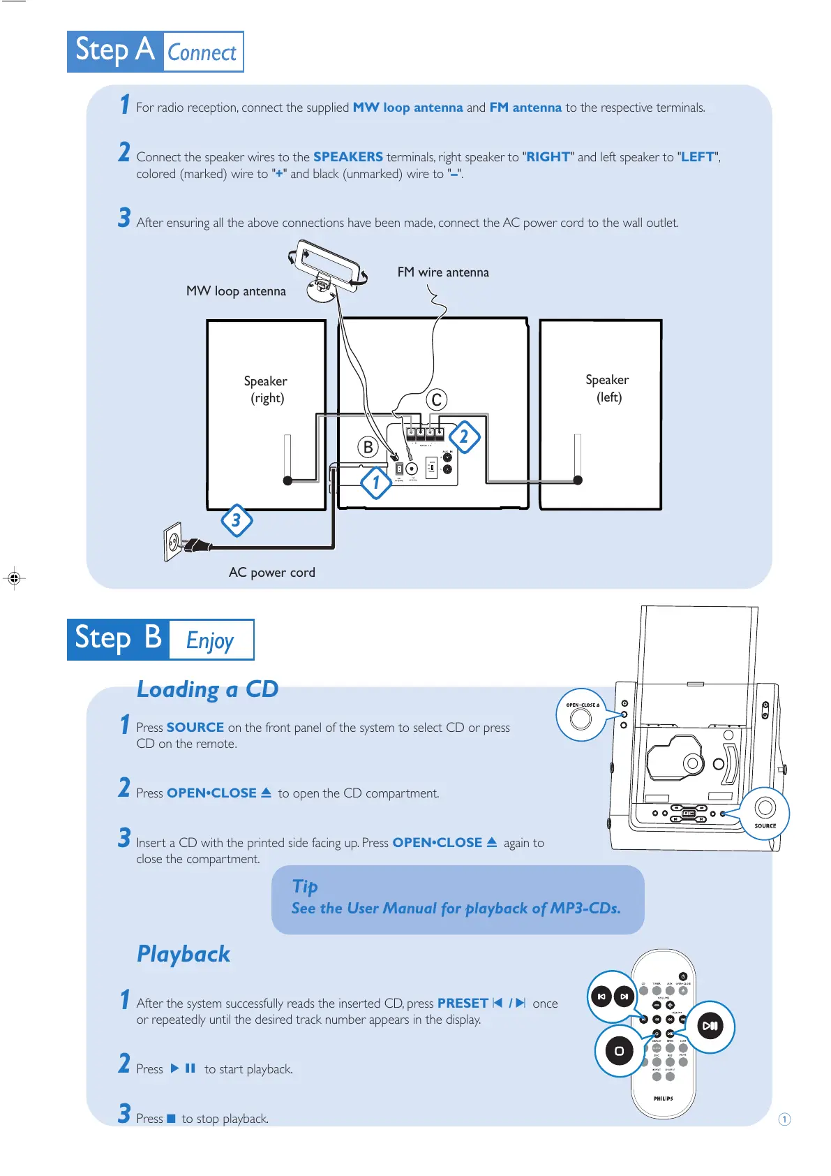 For radio reception, connect the supplied MW loop antenna and FM antenna to the respective terminals.