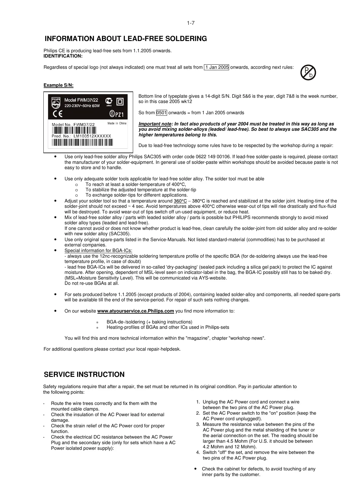 • Use onl y lead-free solder alloy Philips SAC305 with order code 0622 149 00106. If lead-free solder-paste is required, please contact