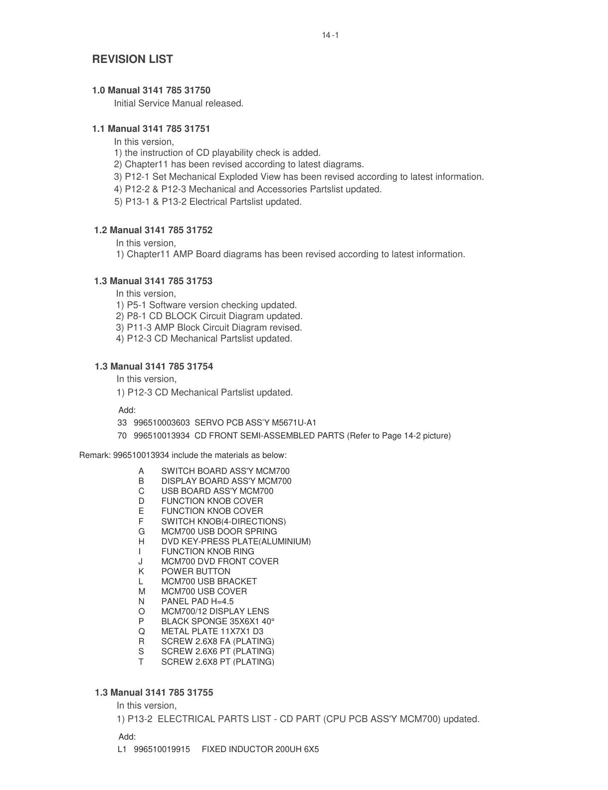 1) P13-2 ELECTRICAL PARTS LIST - CD PART (CPU PCB ASS'Y MCM700) updated.